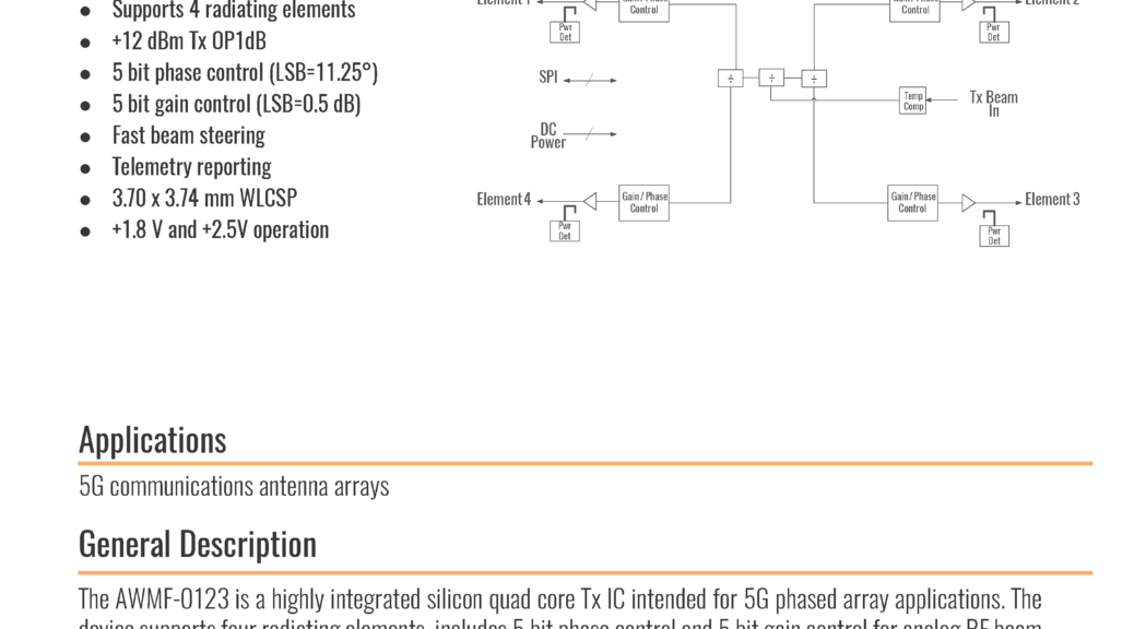 Anokiwave – Ka-Band Silicon 5G Quad Core Tx IC – AWMF-0123